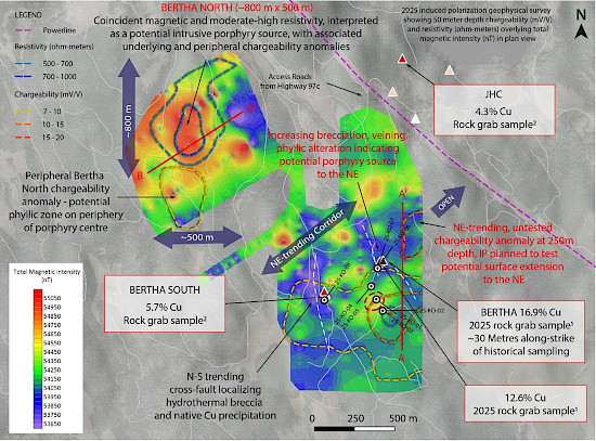 Figure 1. Plan view of the 2025 total magnetic intensity ground magnetic survey with selected rock grab samples, location of 2025 drill holes, and coincident chargeability and resistivity anomalies outlining the Bertha and Bertha North Cu-Au porphyry targets.