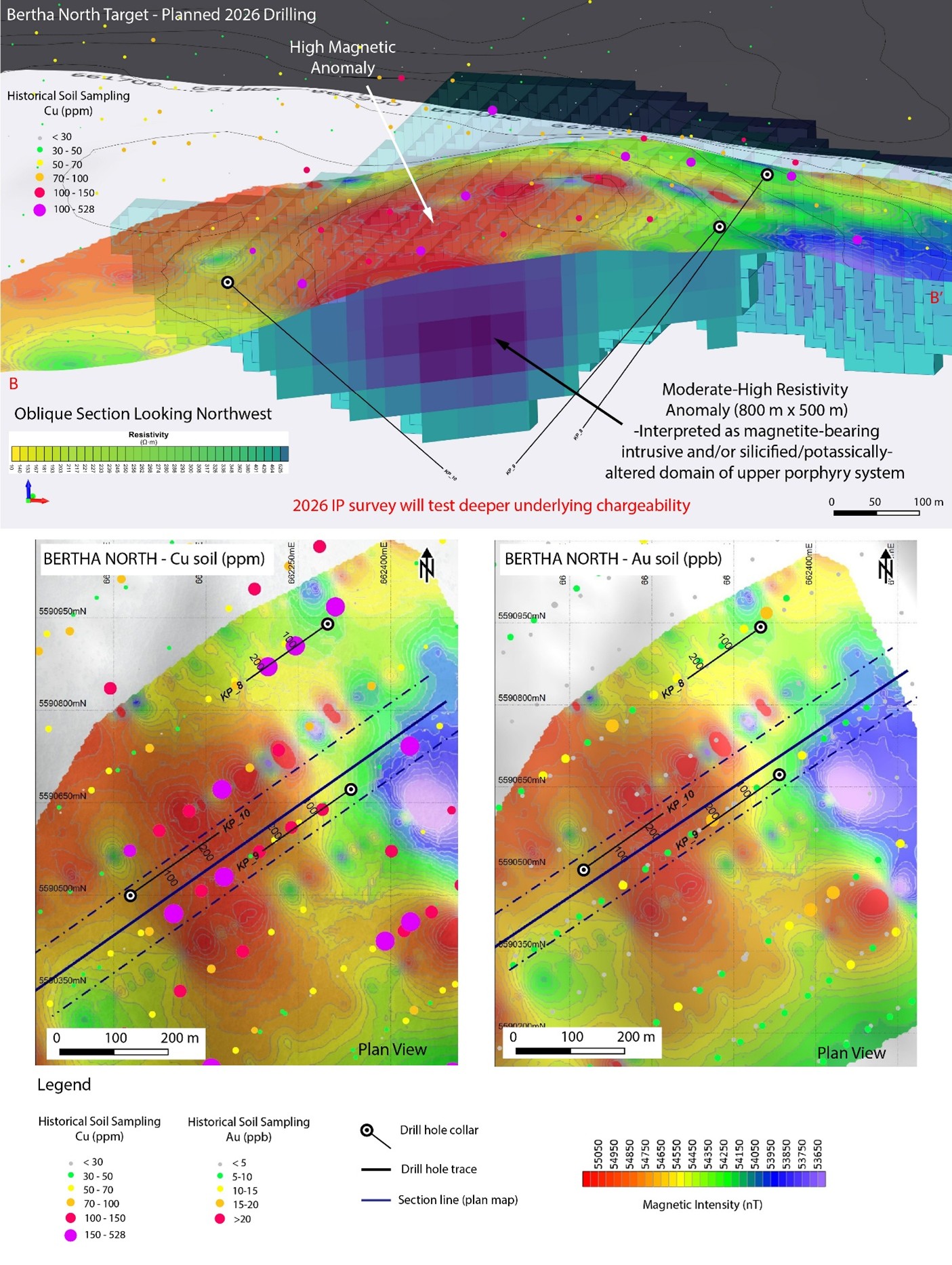 - Chargeability at Depth Enhances Porphyry Prospectivity: 2025 IP data indicates a chargeability response at the depth limits of the 2025 survey, beneath the overlying resistive cap, a geophysical configuration commonly associated with the upper portions of porphyry systems and supportive of a potential porphyry center at depth. To further advance this target, deeper-penetration IP surveys are planned for Spring 2026, to be completed in conjunction with the expansion of the Bertha Zone and designed to extend coverage beyond current depth limits.