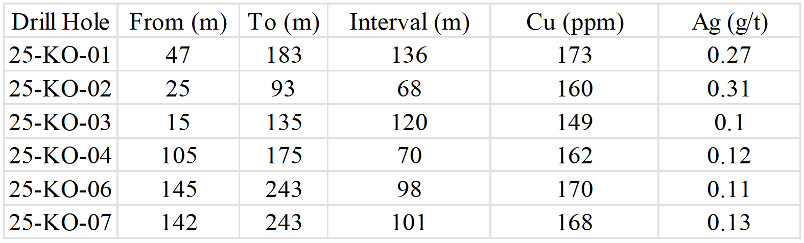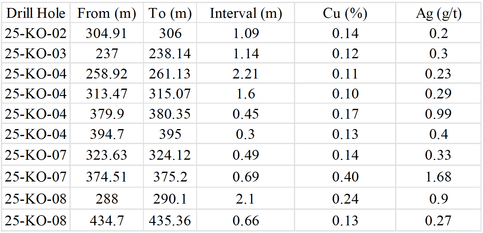 Copper mineralization occurs predominantly as disseminated and vein-hosted native copper and chalcocite within oxidized volcanic and intrusive host rocks, with higher-grade intervals localized within magnetite-bearing veins, hydrothermal breccias, and along picrite redox boundaries. This style of mineralization indicates long-lived and repeated copper precipitation events along structurally focused fluid pathways within the propylitic and phyllic envelopes. Outside the intercept in 25-KO-07 gold values remain weakly anomalous, which is considered significant, as gold is substantially less mobile than copper under oxidizing hydrothermal–supergene conditions. The lack of meaningful gold enrichment suggests that drilling has not yet intersected the sulphide-bearing magmatic source intrusion or the calc-potassic to potassic mineralized core, where gold would be expected to be concentrated in an alkalic porphyry system.