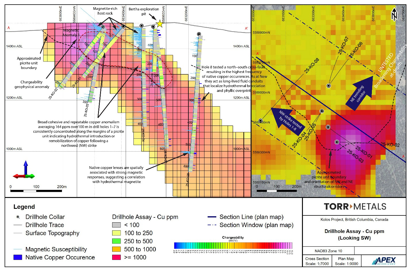 Edmonton, Alberta (AB) -- (January 21, 2026) – Torr Metals Inc. (“Torr” or the "Company") (TSX-V: TMET.V) is pleased to report results from its Phase I 2,733 metre (m) drill program at the Bertha Target within the Company’s 332 km² Kolos Copper–Gold Project in south-central British Columbia. The program successfully confirmed the presence of a large, structurally-controlled hydrothermal copper-gold-silver system and, importantly, defined coherent geological and geophysical vectors toward a high-priority, untested copper–gold target to the northeast (Figure 1, Figure 2).