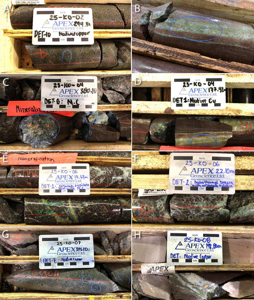 Figure 3. Select 2025 core photos. A. Native copper replacing mafic minerals in picrite. B. Native copper in epidote-carbonate veins hosted in hematized andesite. C. Native copper along chlorite filled fracture. D. Same as (B). E. Native copper in epidote-carbonate veins with hematite rims hosted in hydrothermal breccia in proximity to Bertha exploration pit. F. Hydrothermal breccia with carbonate cement ± dickite (teal clay mineral) ± epidote. G. Native copper replacing mafic minerals in picrite. H. Native copper in epidote-carbonate veins hosted in hematized andesite.