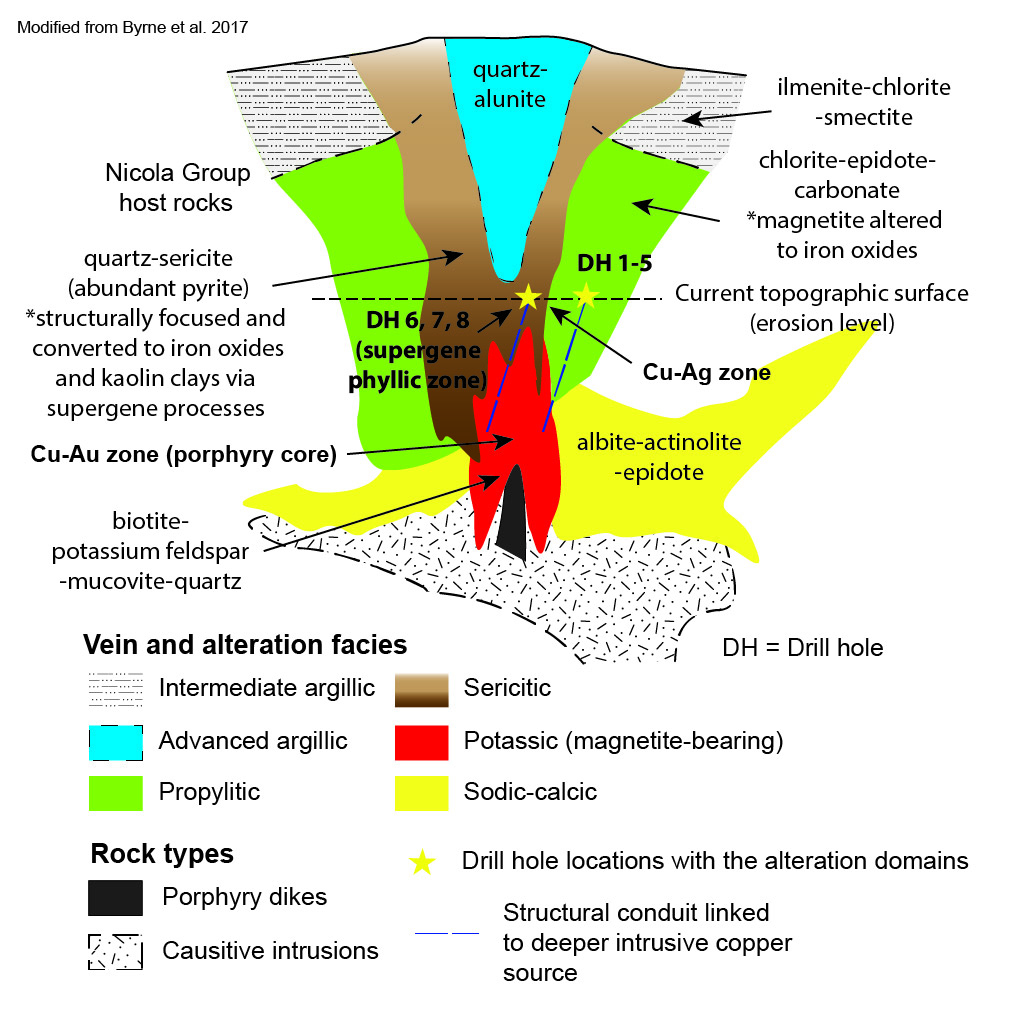 1Byrne, K., Lesage, G, Gleeson, S.A. and Lee, R.G. (2017): Large-scale sodic-calcic alteration around porphyry copper systems: examples from the Highland Valley Copper district, Guichon batholith, south-central British Columbia; in Geoscience BC Summary of Activities 2016, Geoscience BC, Report 2017-1, p. 213–222.