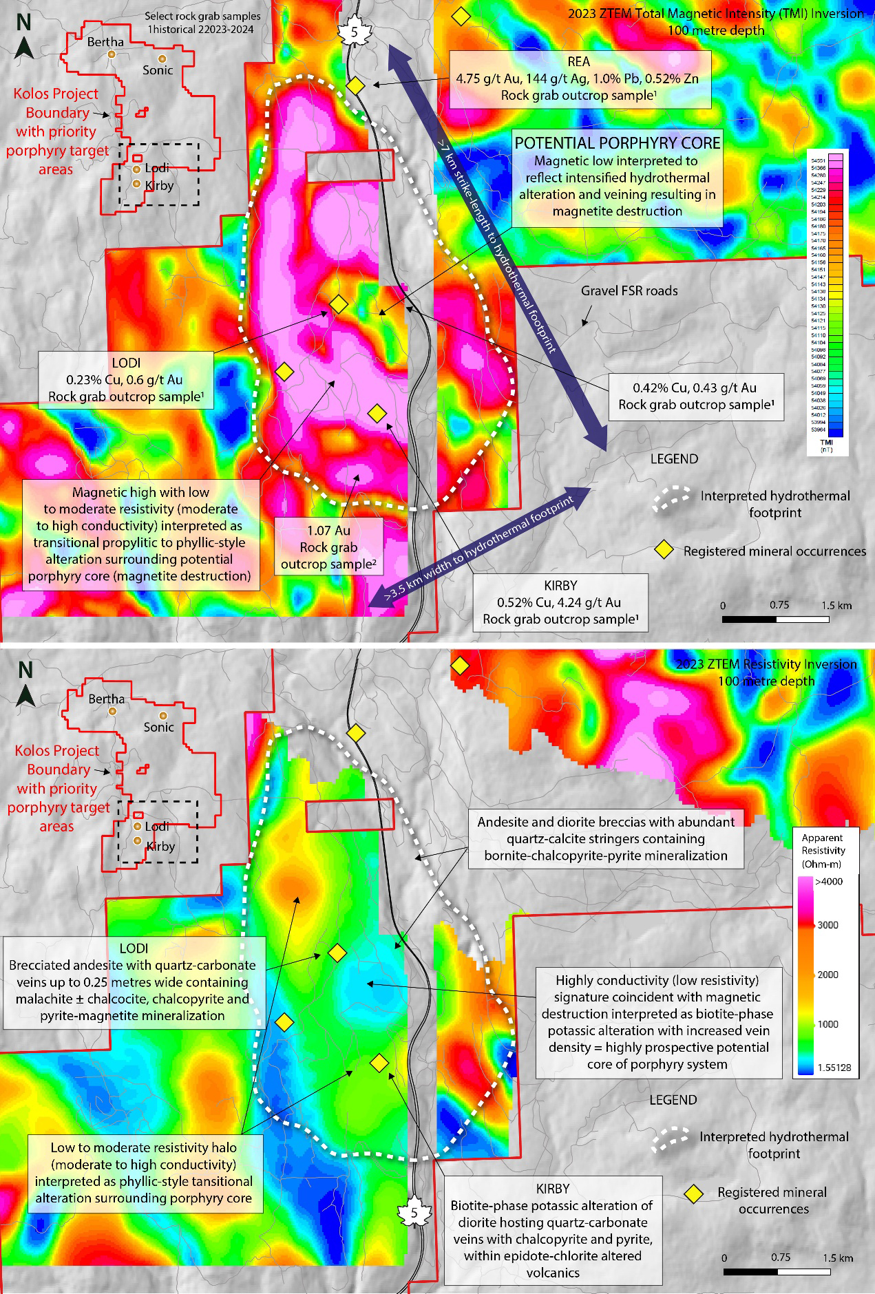 Figure 1. Newly inverted 2023 ZTEM total magnetic intensity (TMI) (above) and resistivity (below) geophysical surveys with outlined hydrothermal footprint, annotated registered mineral occurrences, and select rock grab samples.