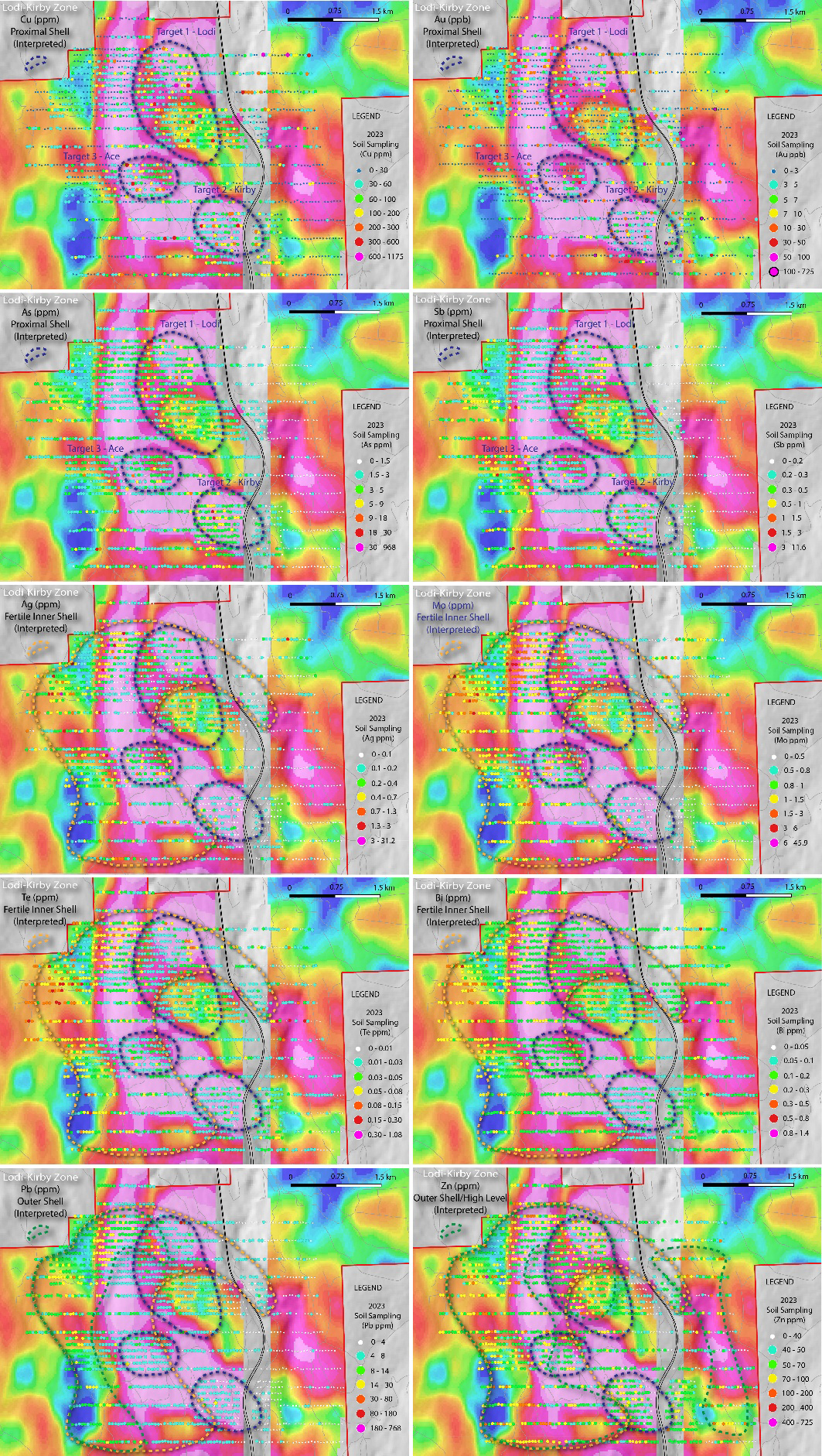 Figure 2. 2023 soil samples displaying pathfinder elements for the interpreted proximal, inner, and outer shells of a large-scale cluster porphyry system including the Lodi, Kirby, and Ace targets; overlying newly inverted 2023 ZTEM total magnetic intensity (TMI) geophysics.