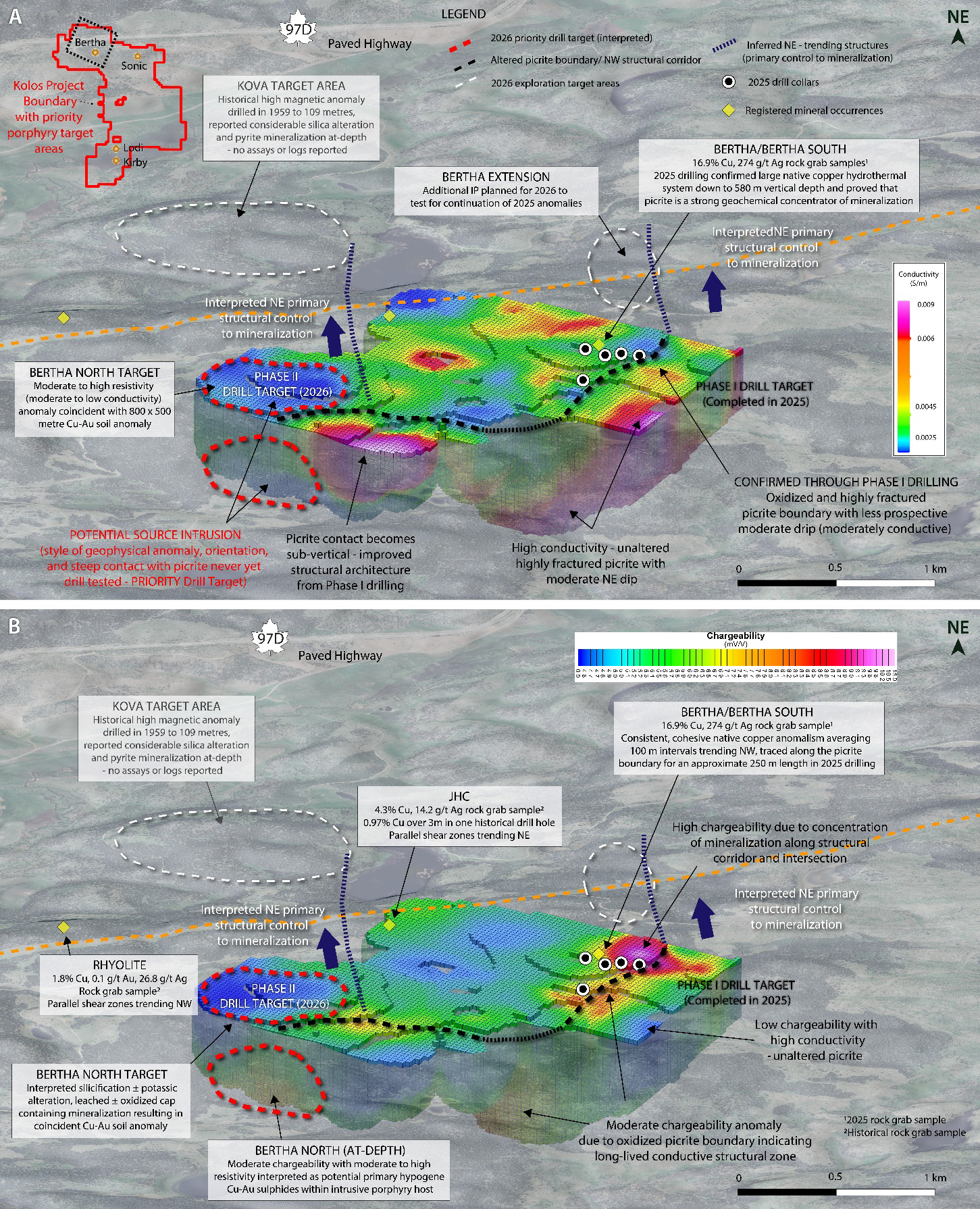 - Kova Target Expands System Along NE Trend: Located along a primary structural control to mineralization approximately 2.2 kilometres from Bertha North, the new Kova target is defined by an identical magnetic geophysical anomaly. Historically, a single 109 m vertical drill hole intersected strong silica and pyrite, consistent with phyllic alteration suggestive of potential proximity to a separate porphyry centre (Figures 1A, 1B). In addition, approximately 200 reconnaissance soil samples are currently being collected to further assess and refine the target area.
